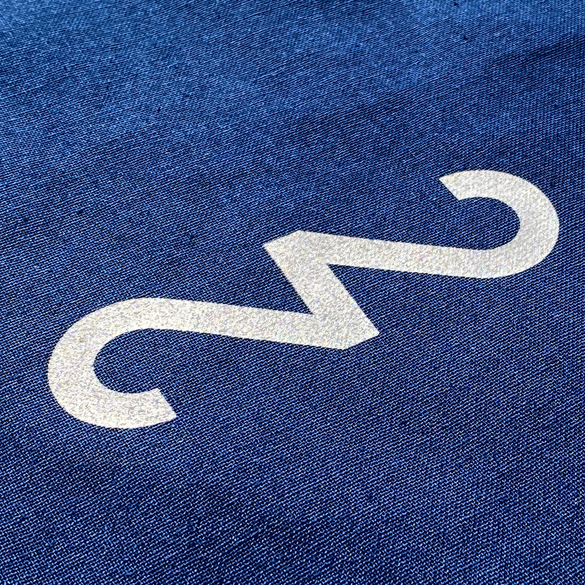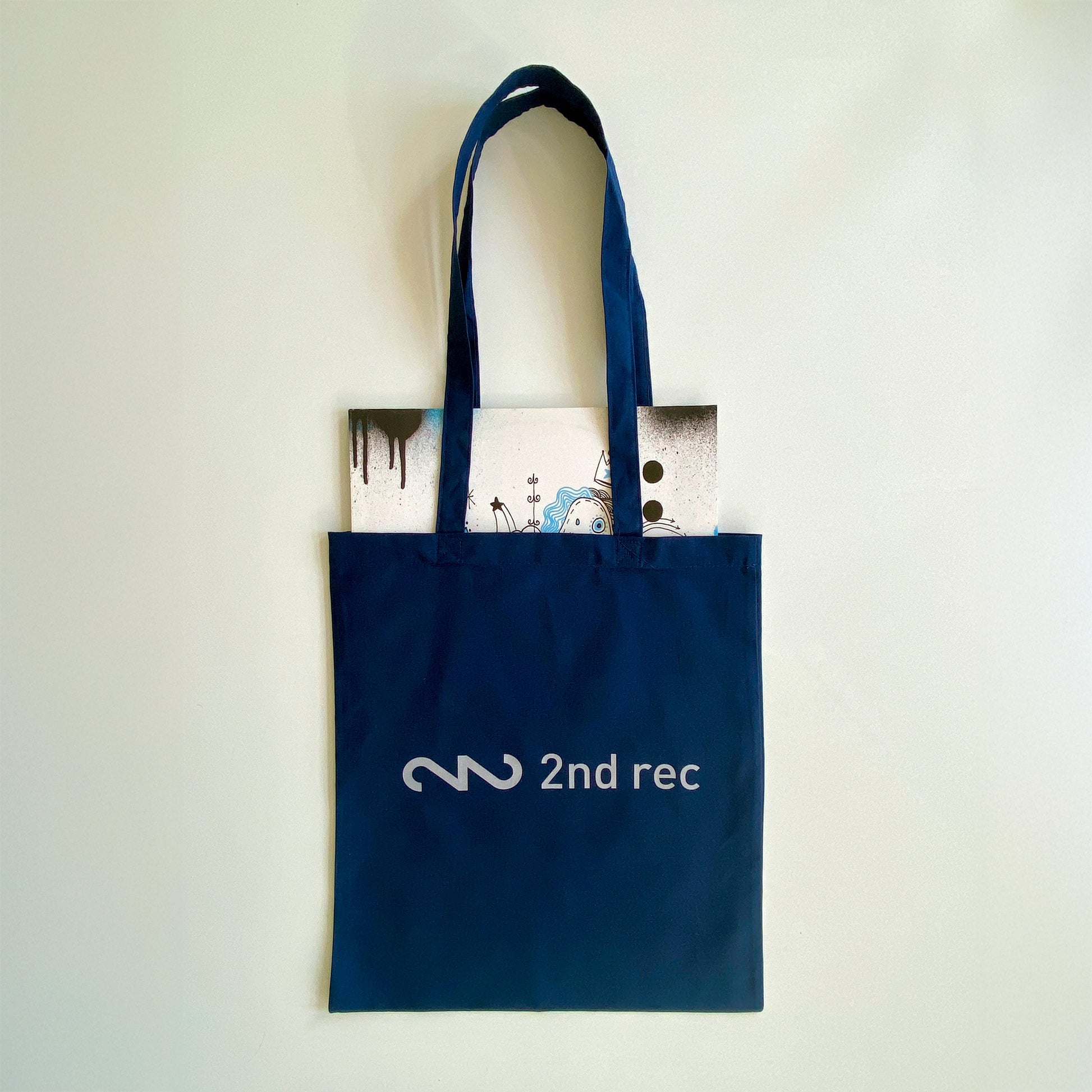 Navy blue bag with long handles made from organic cotton. Silver logo print on both sides. Perfect to carry your vinyl records (or groceries) in style.